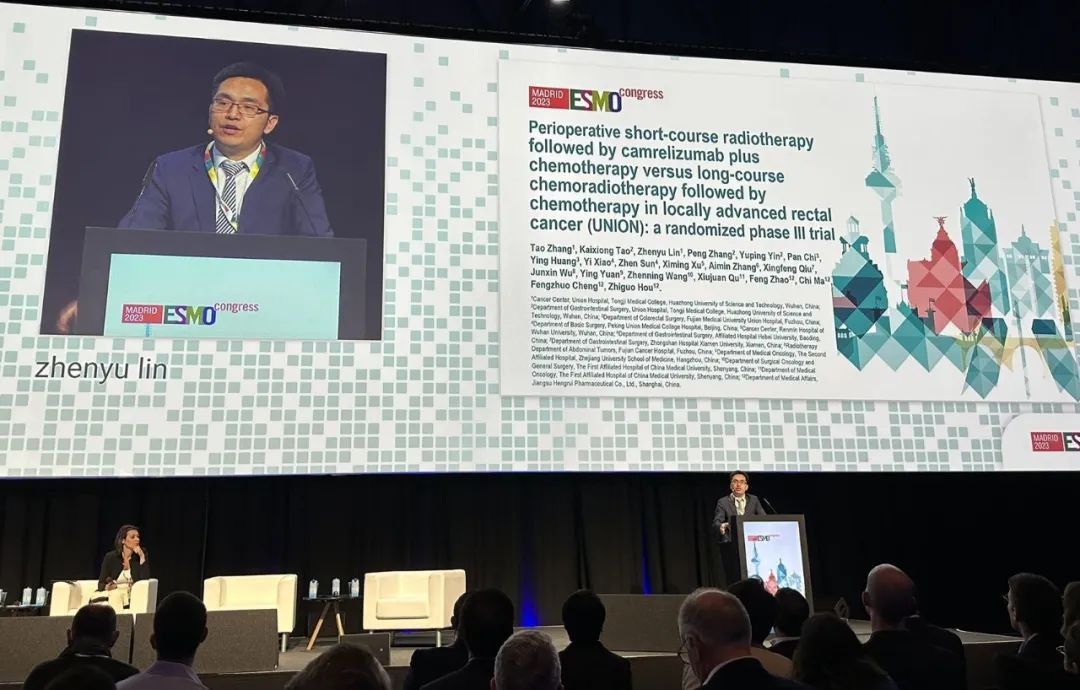 10月21日,k8凯发天生赢家·一触即发医药创新药卡瑞利珠单抗的一项研究“新辅助短程放疗序贯卡瑞利珠单抗联合化疗对比长程放化疗序贯化疗治疗局部晚期直肠癌”随机对照Ⅲ期试验(UNION)亮相2023 ESMO大会优选口头报告现场。该研究由华中科技大学同济医学院附属协和医院张涛教授、陶凯雄教授担任主要研究者,华中科技大学同济医学院附属协和医院林振宇教授在大会现场报告了该重磅研究的结果1。此项研究是全球首个评估短程放疗序贯免疫治疗联合化疗治疗局部晚期直肠癌的Ⅲ期研究,已达到主要终点病理完全缓解(pCR),有望为直肠癌患者的治疗提供新策略。